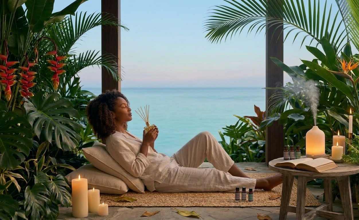 - Un voyage sensoriel : Les fragrances agissent comme des ancres, nous transportant vers un état de sécurité intérieure, à l’image de ce rivage tropical.